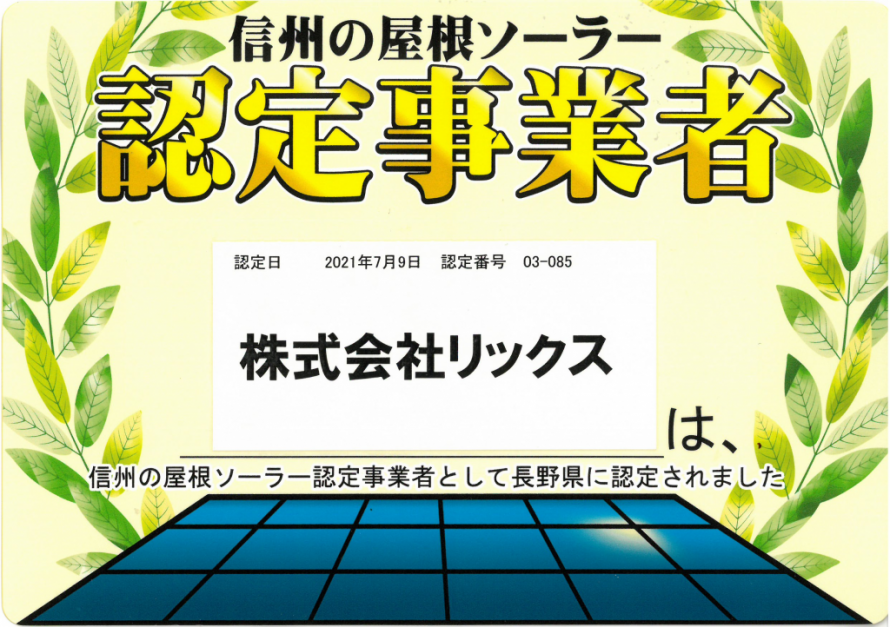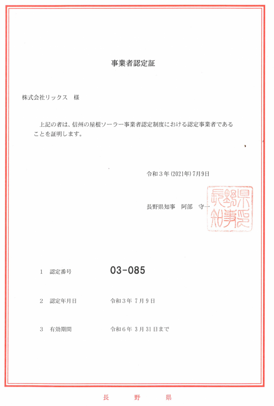 この度、長野県より「信州の屋根ソーラー事業者認定制度における認定事業者」として認定をいただきました