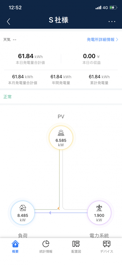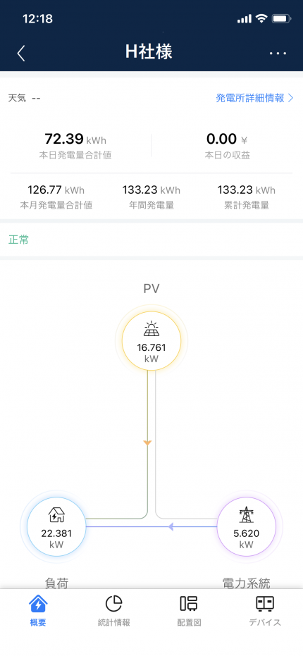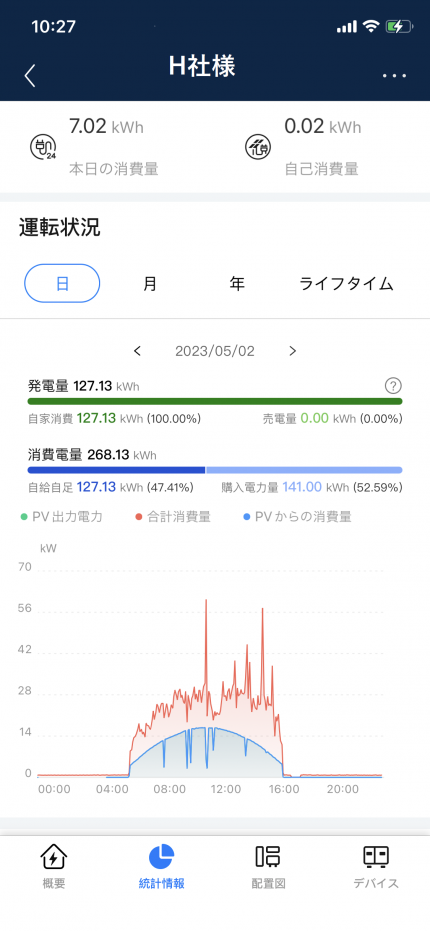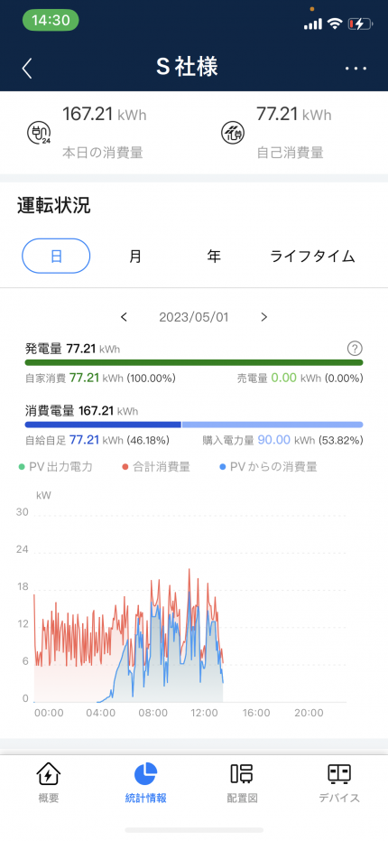 HUAWEI製でもこのように、スマホで発電状況と、工場内の電気使用量に合わせてどのように太陽光の電気が自家消費に回っているかを把握することが出来ます