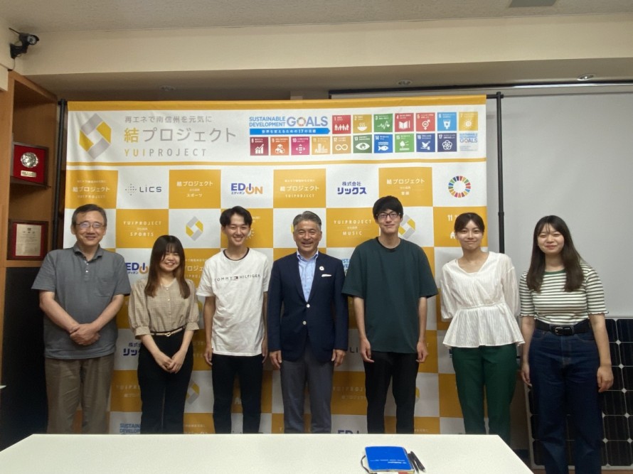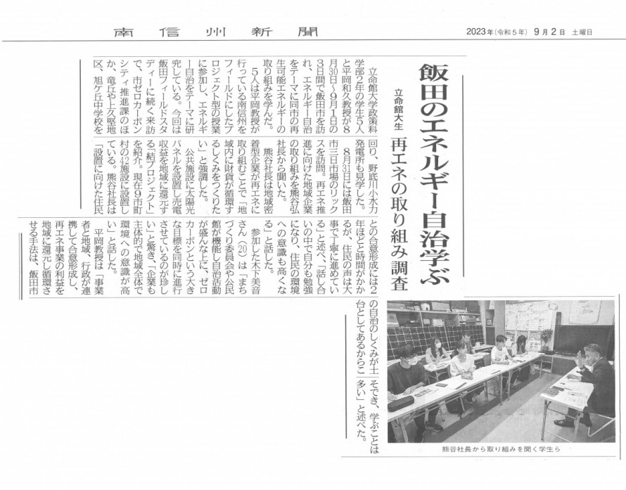 平岡教授が行っている南信州をフィールドにしたプロジェクト型の授業に参加し、エネルギー自治をテーマに研究をされており、今回は「飯田市のエネルギー自治」を学ぶ目的で来社いただきました