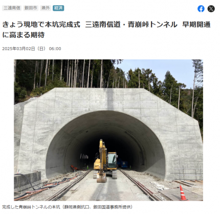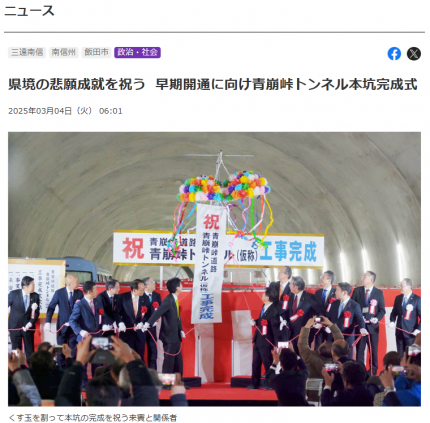 先日は国内でも類を見ない難工事個所とも言われていた青崩峠トンネル(仮称:4998m)の工事完成式典が開催されました