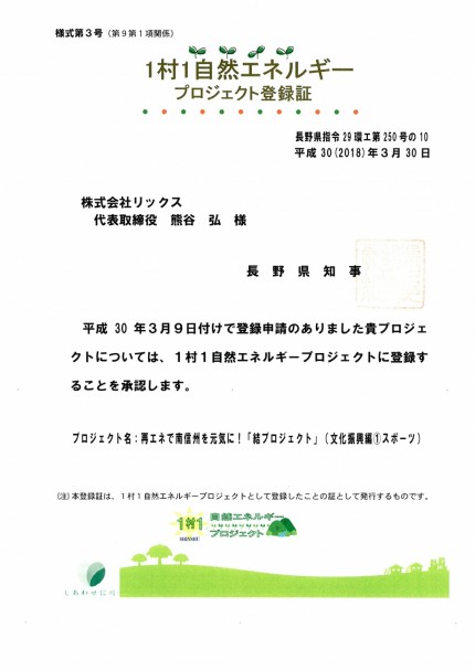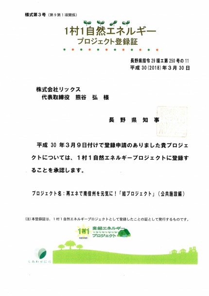 長野県「1村1自然エネルギープロジェクト」に登録されました! 【飯田市 株式会社リックス】