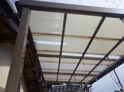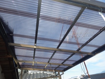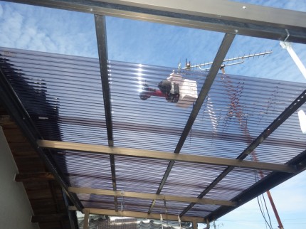 後日張替え工事にお伺いしました。H様は透明じゃなく頑丈なものが良いとご要望がありポリカーボネート樹脂のタイプで施工しました