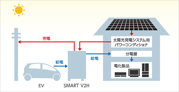 つまり自動車を敷地内に駐車している間は、自動車の蓄電池を家庭内の発電システムの一部として、充電・放電するという双方向な電力のやりとりを行うことができます。